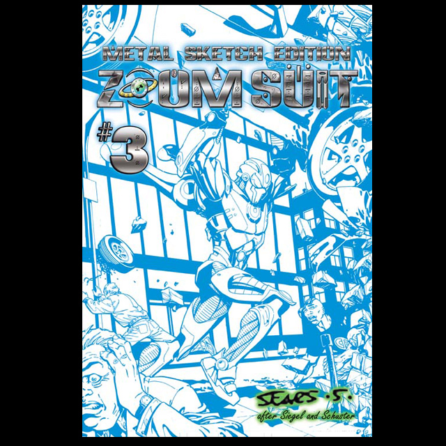 Limited Edition of 5,000 copies showcasing the line artwork to Bart Sears ZOOM SUIT homage to Action Comics #1, entitled, “IN ACTION.” Bart Sears crisp pencil and ink work is presented entirely in METALFX metallics.
