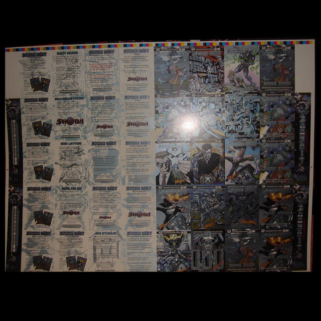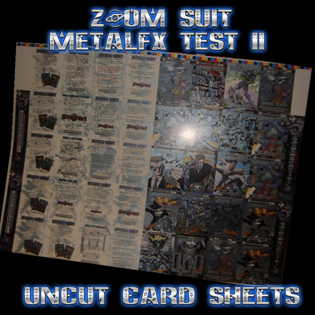 FULL METALFX MULTIPLE SETS AND RARITIES ON THIS UNCUT SHEET. Notice John Taddeo’s constant guerilla marketing, and attempting to make the most out of shoestring budgets. If you look carefully at this uncut sheet, you will find Three (3) Complete Card sets! Two (2) Sets of a Three Card Set featuring the ZOOM SUIT Direct Market Covers (Mailed Free to All Fans Requesting Trading Cards at the SUPERVERSE Website), and a Fourteen Card (14) Set Sold at Film Festivals and comic cons. Also note, John even utilized the narrow remaining edge of these sheets to produce ZOOM SUIT Book Mark size promos.