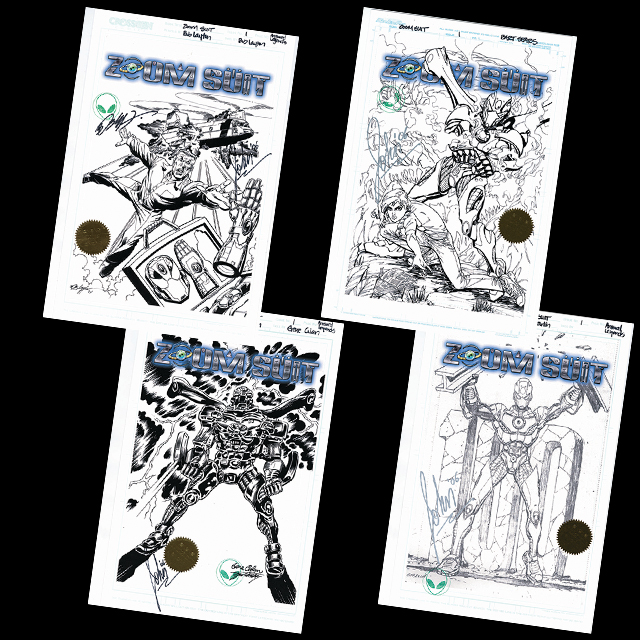 Four (4) Museum Quality 11×17 Lithograph Prints, printed on heavy Bristol board, and featuring the artwork of The ZOOM SUIT #1 ARMORED LEGENDS COLLECTION. Bob Layton pencils a homage to his own work on the legendary cover of Iron Man #118. Bart Sears pencils a homage to his own work on the legendary cover of X-O Man-O-War #14. Gene Colan pencils a homage to his own work on the legendary cover of Iron Man #1, and Jim Starlin pencils a homage to his own work on the legendary cover of Iron Man #100. All Four (4) lithographs are hand signed by ZOOM SUIT creator John Taddeo. Each museum quality lithograph is printed on heavy 11×17 Bristol board, stamped with the ZOOM SUIT “Green Alien Head” seal, and also affixed with the Superverse gold foil embossed ZOOM SUIT Seal. Limited to 100 autographed sets.